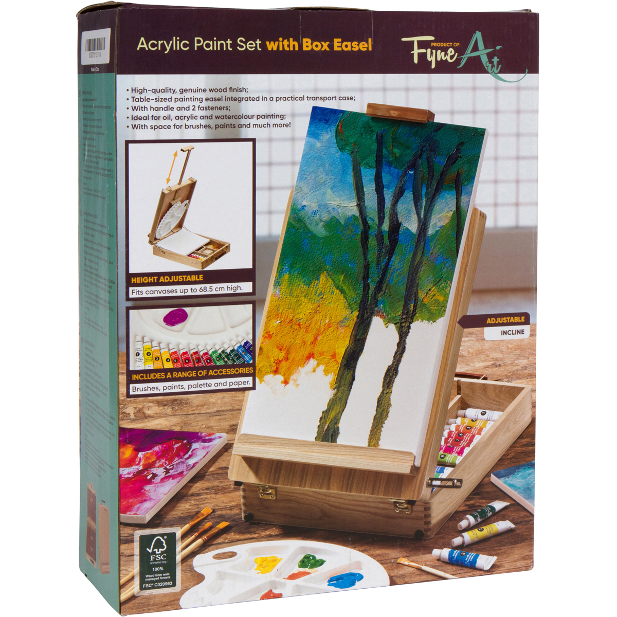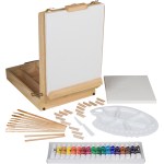Our Gallery Fyne Art Artist Easel Set 51 Piece Artist Easel Set 2 wooden framed canvases Wooden Easel Storage Box 18 piece Acrylic Paint set (12 ml each) 10 high quality nylon brushes (size 4 – 22) & 2 pencils Paint pallete with Painters knife & 2 sets of wedges Share this: Click to share on X (Opens in new window) X Click to share on Facebook (Opens in new window) Facebook Like Loading...